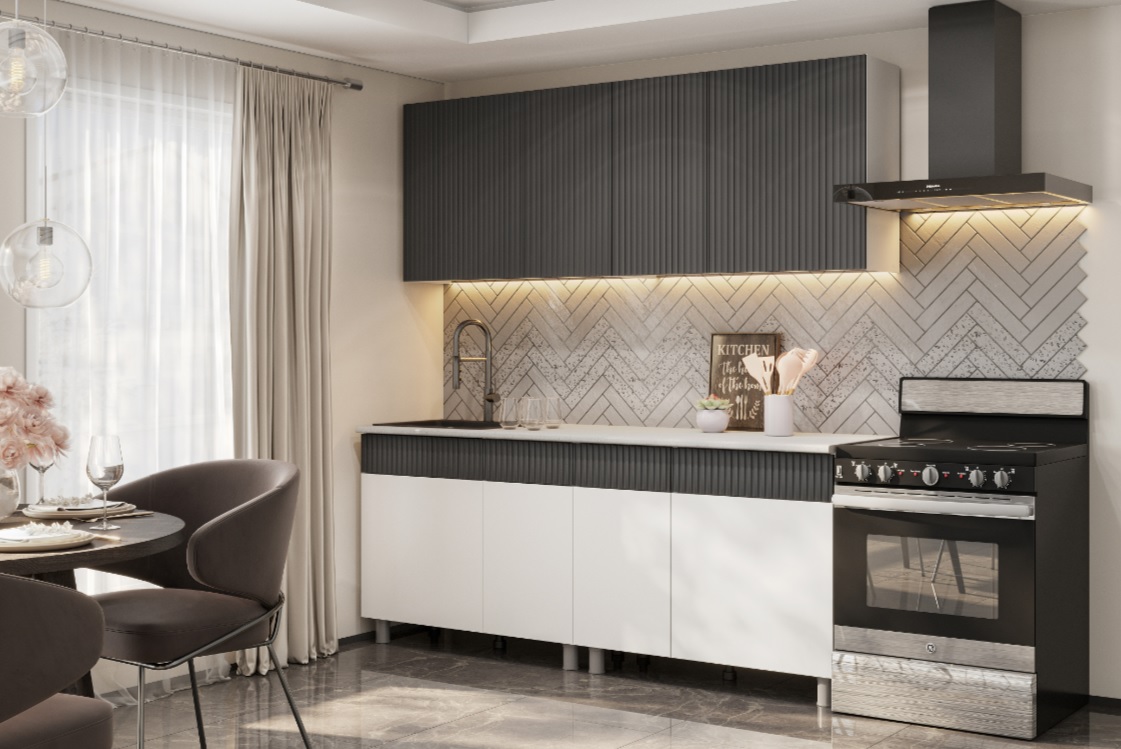 Мойка, стеновая панель, посудосушитель в стоимость не входят.
